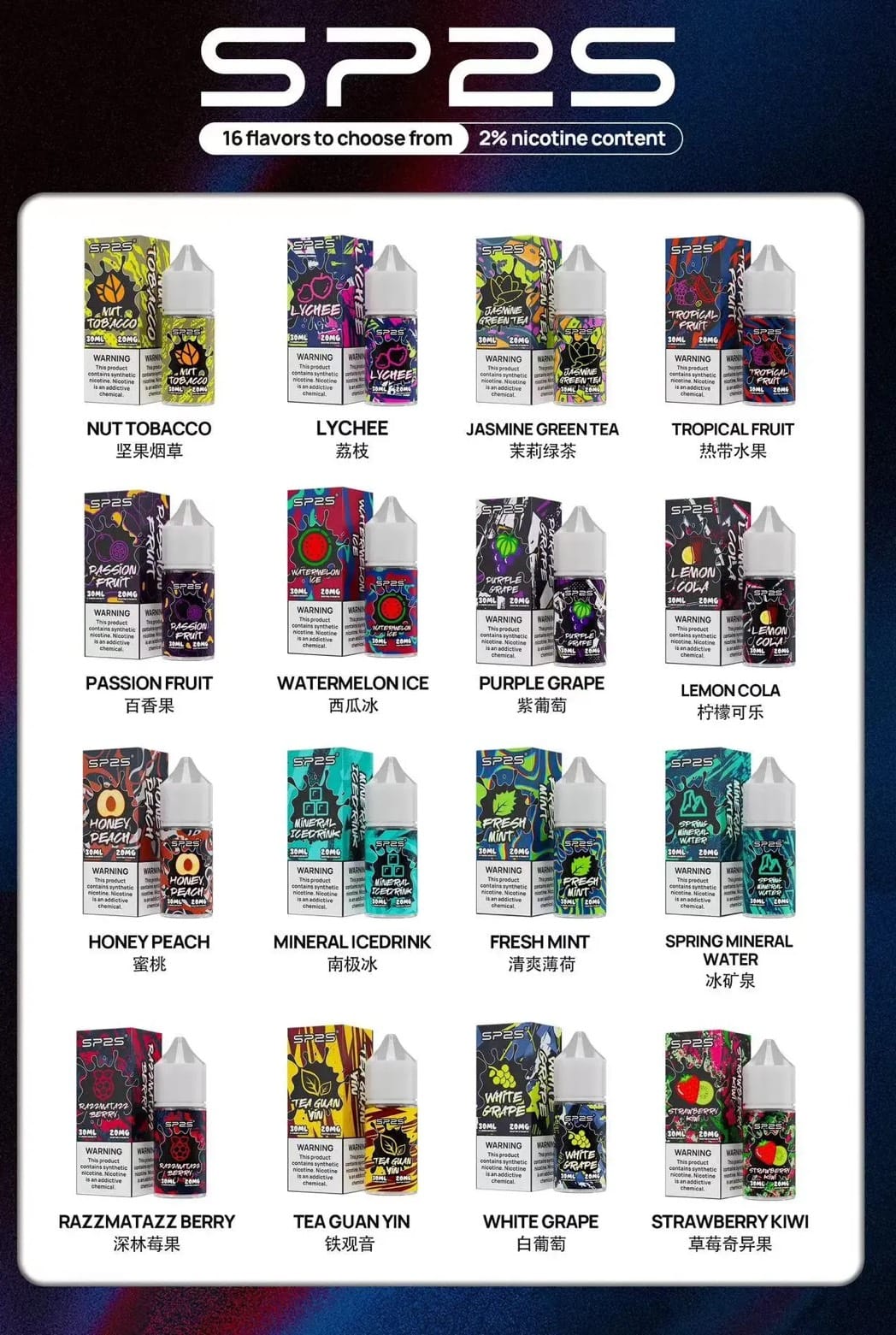 堅果菸草 ,荔枝 ,茉莉綠茶 ,熱帶水果 ,百香果 ,西瓜冰 ,紫葡萄 ,檸檬可樂 ,蜜桃 ,南極冰 ,清爽薄荷 ,冰礦泉 ,森林莓果 ,鐵觀音 ,白葡萄 ,草莓奇異果 |